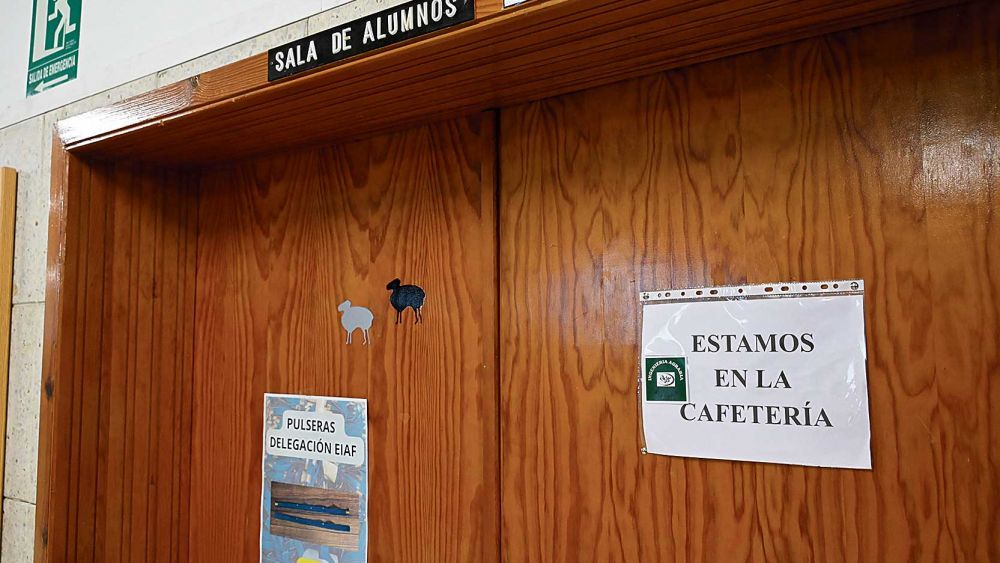 La verdad es que el cartel sobra;cualquiera que llegue hasta la puerta, con cualquier conflicto en la cabeza, y la encuentre cerrada se va a dirigir a la cafetería, sin necesidad de leer el aviso de que están allí. ¿Dónde si no?