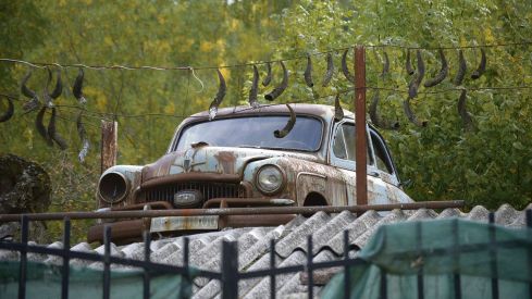 Un viejo coche, una matrícula y unos cuernos de cabra componen todo un mundo que ya no existe, pero que todos recuerdan cuando atraviesan el camino y miran hacia ese tejado hasta el que ha subido el coche, nadie se explica cómo.