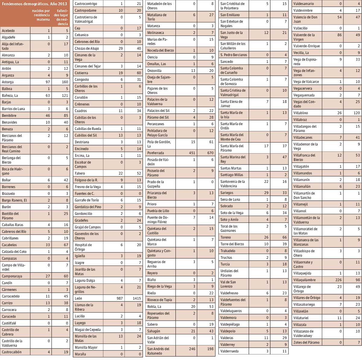 Durante el 2012 habían sido siete los ayuntamientos que registraron un saldo vegetativo positivo: Bercianos del Real Camino (+2), Cabañas Raras (+1), Calzada del Coto (+1), Riaño (+1), Sariegos (+20), Valverde de la Virgen (+33) y Villaquilambre (+141) –cuatro de los cuales repitieron al año siguiente–. Se quedaron ‘a pre’ en Cubillos del Sil, Escobar de Campos, Prado de la Guzpeña y Valdemora.