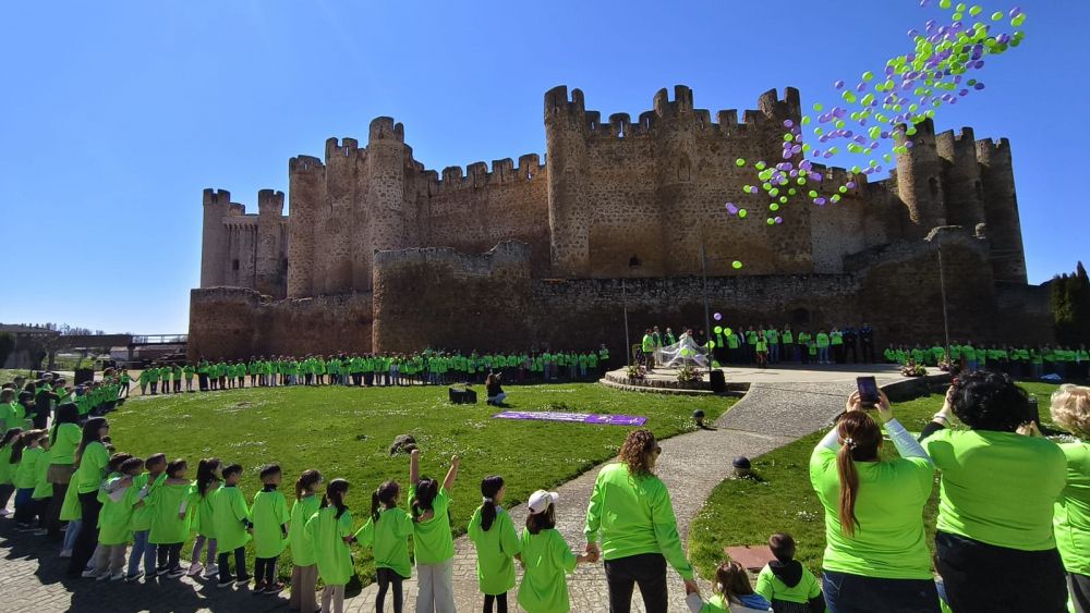 El acto principal de la programación ha tenido lugar este martes con el 'abrazo solidario' de Valencia de Don Juan a las enfermedades raras en las inmediaciones del castillo en el que han participado cerca de 300 niños y niñas de la Escuela Infantil PequeCoyanza, del CEIP Bernardino Pérez y del IES Fernando I, así como público en general, en una jornada soleada ideal para escenificar este abrazo por una buena causa y que este año tampoco se la quiso perder el pequeño Darío.