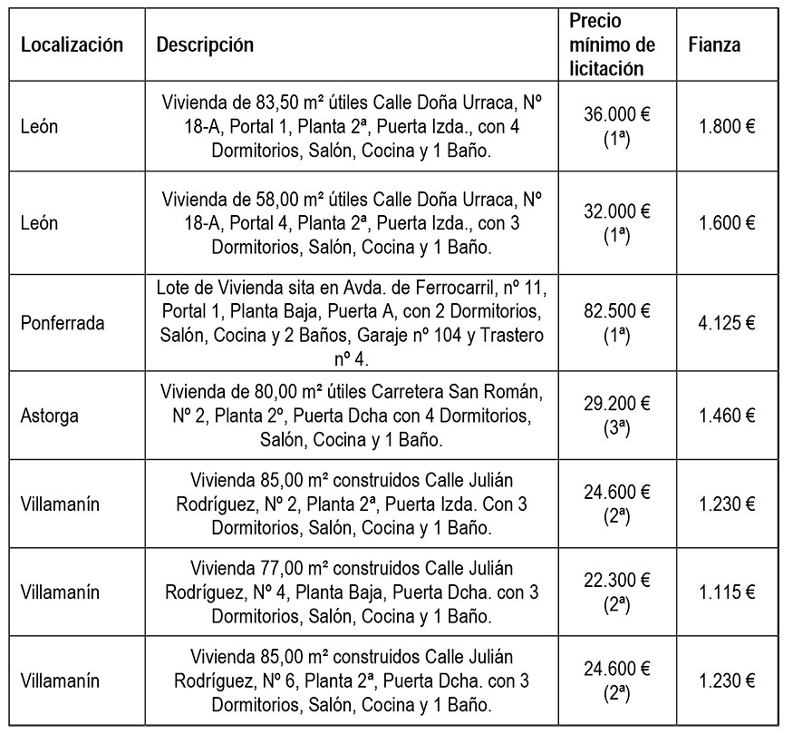 Se trata de siete inmuebles en la provincia de Ávila (dos en la capital y cinco en San Pedro del Arroyo), otras tantas en León (dos en la capital, una en Astorga, tres en Villamanín y un lote (constituido por vivienda, garaje y trastero) en Ponferrada; siete más Palencia (todas en la capital); seis en Salamanca (dos en Peñaranda de Bracamonte y cuatro en Babilafuente); tres en Valladolid (dos en la capital y una en Medina del Campo) y 11 en Segovia (todas en Ortigosa del Pestaño).