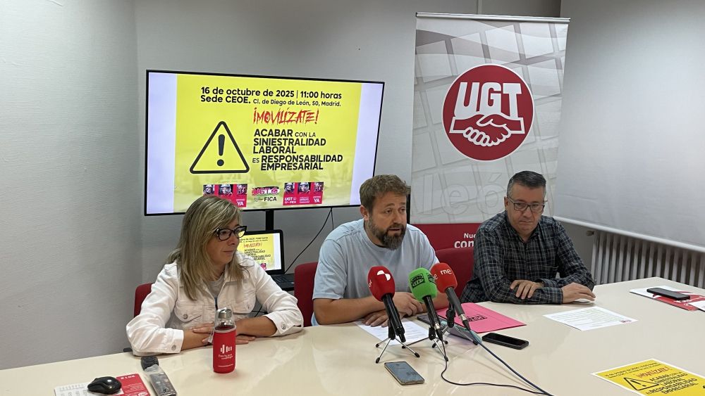 Sandra Vega, secretaria general de UGT Fica en Castilla y León, acompañada por Juan Carlos García, secretario autonómico de Salud Laboral y Medio Ambiente, y René Rodríguez, secretario general de esta federación del sindicato en León, han informado de que la provincia es "una de las que tienen mayores índices" en lo que a accidentes laborales se refiere. Igualmente, los representantes sindicales han anunciado una movilización en Madrid, frente a la sede de la Confederación Española de Organizaciones Empresariales (Ceoe) para exigir a las empresas mayor compromiso con la seguridad de sus trabajadores bajo el lema 'Acabar con la siniestralidad laboral es responsabilidad empresarial'.