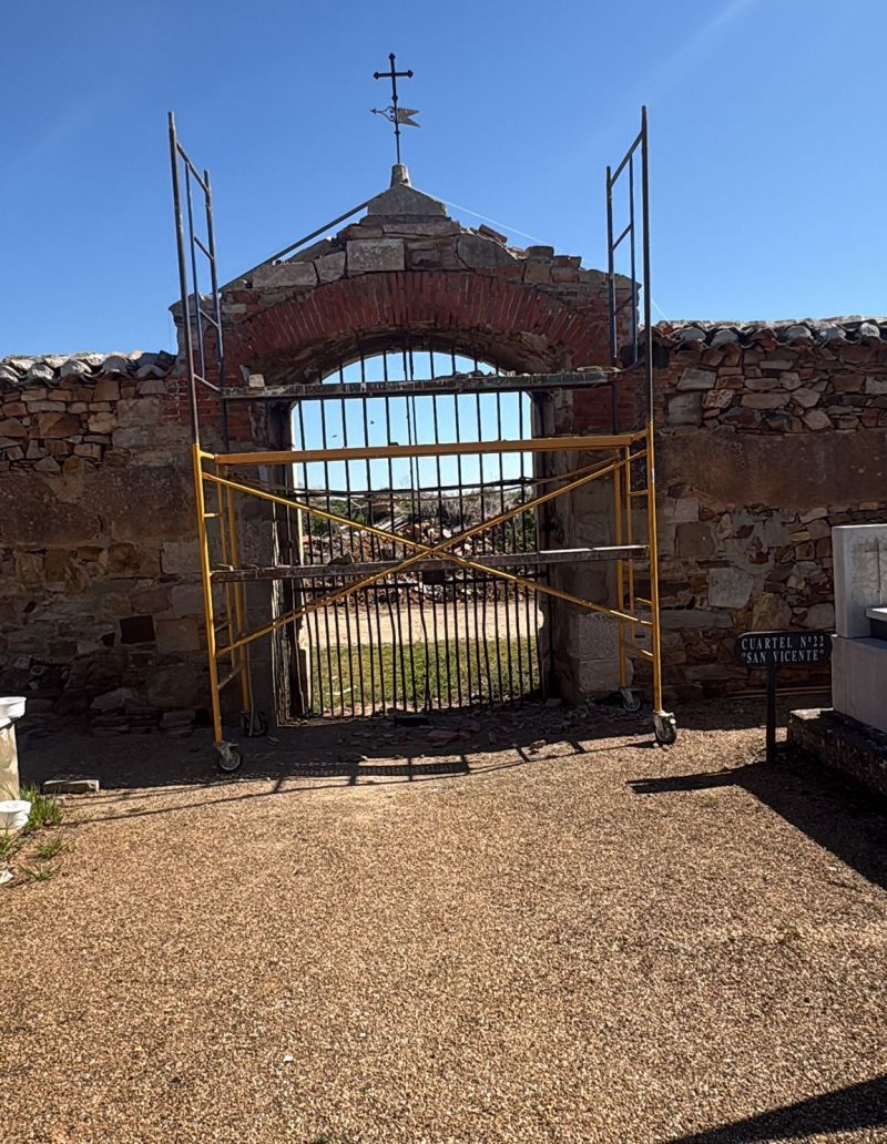 Entre los trabajos en marcha se encuentra la intervención en las paredes del recinto, donde se está reforzando el alero que rodea el muro perimetral. Asimismo, se actúa sobre los accesos al cementerio mediante tareas de pintura y restauración, con el fin de mejorar tanto la seguridad como la imagen del espacio.