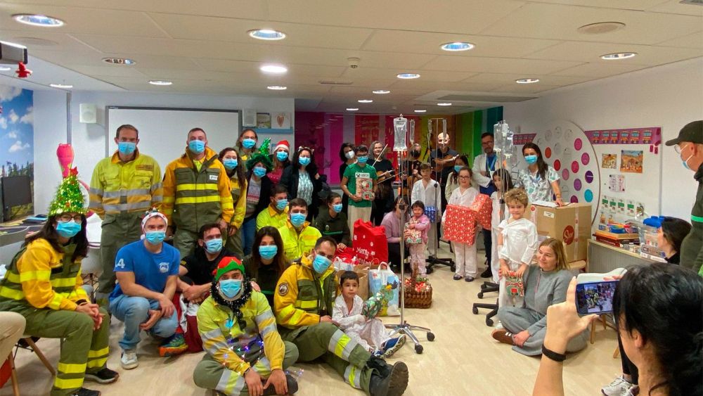 Los Bomberos Forestales de León se acercaron este lunes al Hospital Universitario de León para entregar, como ya viene siendo tradicional cada año, unos regalos a las niñas y niños ingresados en la planta de Pediatría. Una vez allí, se sumaron al público, integrado por pacientes, familiares y personal, del concierto solidario del cuarteto de cuerda Corazones Acordes, formado por profesores del Conservatorio, en el aula hospitalaria.