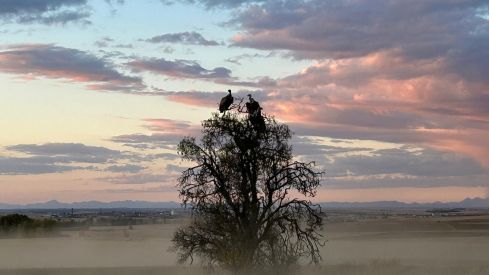 Las imágenes tomadas ese día en Grajal de Campos muestran a estos carroñeros posados en distintos árboles de la zona, recortándose contra un cielo teñido de colores cálidos que transformaban el paisaje abierto en un escenario casi mágico. A medida que avanzaba el atardecer, los buitres fueron ocupando las ramas, sumando un toque singular a un entorno ya de por sí impresionante.