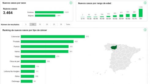 Por tipo de cáncer, destaca el colorrectal, con 512 nuevos diagnósticos, el de próstata (422), el de pulmón (382), el de mama (381), el de vejiga (275), el de piel (200) y el de páncreas (114).