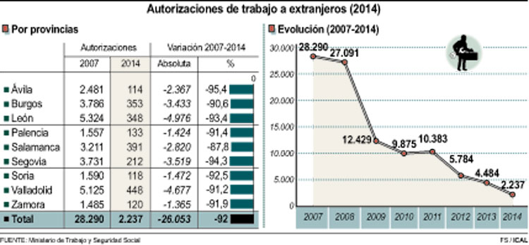 Es preciso señalar finalmente que las cifras que aporta el departamento que dirige Fátima Báñez reflejan que de los 2.237 permisos a trabajadores extranjeros contabilizados el año pasado en Castilla y León, la mayor parte, 2.101, fueron por cuenta ajena, frente a los 105 por cuenta propia. Cabe destacar también que las cifras desglosadas por sexos establecen que el mayor número de autorizaciones correspondió a mujeres, 1.283, frente a las 954 para hombres.