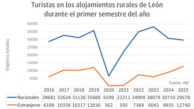 A pesar del ‘boom’ de viajeros nacionales que optaron por el turismo rural tras la irrupción del coronavirus, con récords en 2022 y 2023, todavía no se ha logrado alcanzar las cifras previas a la pandemia. De este modo, en lo que se refiere a clientes totales en las casas rurales de León durante la primera mitad del año, el volumen más elevado se alcanzó en 2019 con casi 48.000 turistas.