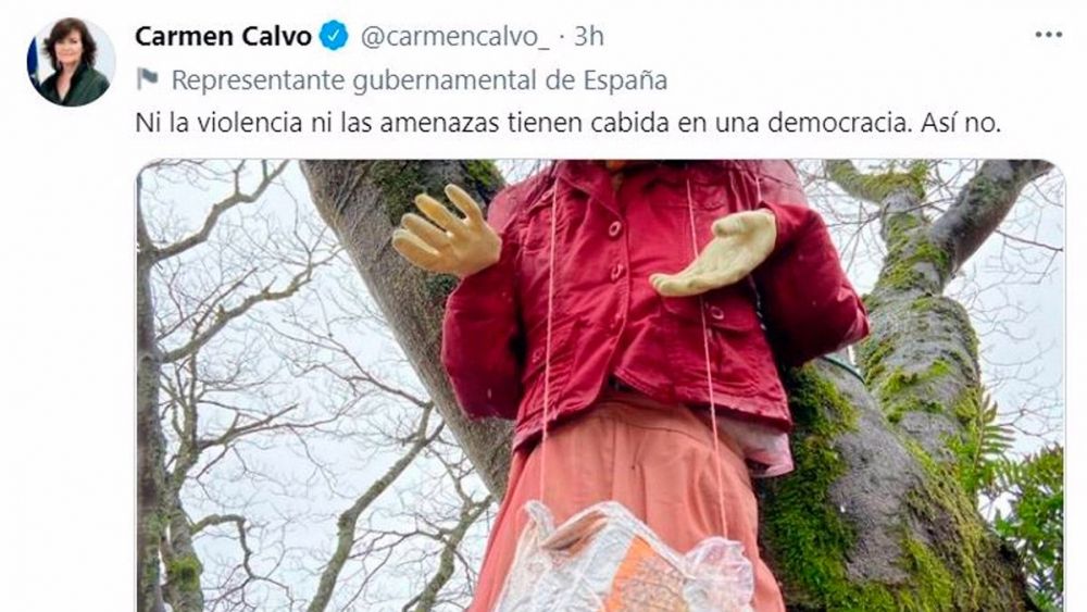 "Ni la violencia ni las amenazas tienen cabida en una democracia. Así no", ha señalado este sábado Calvo en una publicación en su cuenta de Twitter, enlazando la publicación de elcomún.es, medio que informa de esta acción.