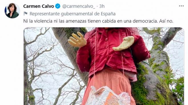 La vicepresidenta primera y ministra de la Presidencia, Relaciones con las Cortes y Memoria Democrática, Carmen Calvo, ha condenado la aparición de una muñeca ahorcada con su cara en un árbol, una fotografía difundida por un medio digital.