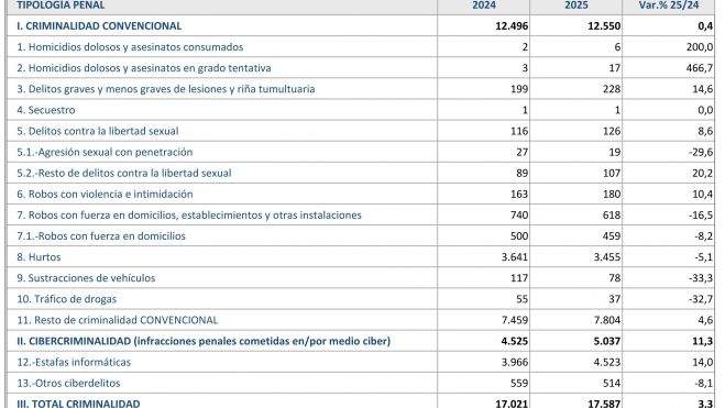 Sin embargo, como decíamos al inicio, esa tendencia al alza es mucho más leve en el caso de la criminalidad convencional, puesto que el número de infracciones penales se sitúa en 12.550, lo que supone una media de 34 cada día tras un crecimiento del 0,4% con respecto a las 12.496 que se habían contabilizado durante el año 2024, tal y como figura en la tabla que acompaña a esta información.