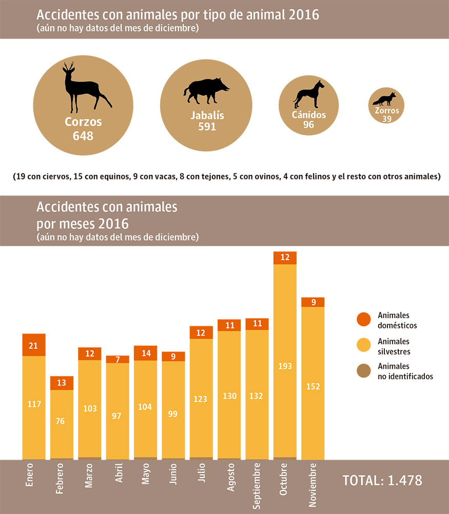 Son los animales silvestres los que con mayor frecuencia se ven involucrados en estos sucesos, especialmente los corzos y los jabalís, que en 2016 representaron el 94% de estos accidentes.