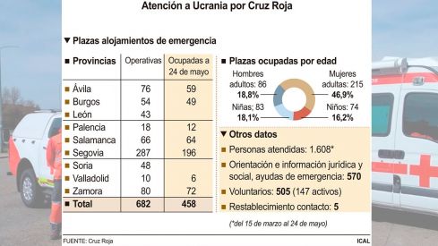 El informe de Cruz Roja, con datos entre el 15 de marzo y el pasado martes 24 de mayo, recoge que la organización cuenta con 682 plazas operativas de alojamientos de emergencia, de las que 458 ya están ocupadas. Segovia es la provincia que acoge más ucranianos refugiados (196), seguidos de los 72 de Zamora, los 64 de Salamanca, los 59 de Ávila y los 49 de Burgos. El número de alojados por dispositivos gestionados por Cruz Roja es inferior en provincias como Palencia (12) y Valladolid (seis), a los que habría que sumar los 14 que llegaron el pasado miércoles a Soria y que no están recogidos en las estadísticas facilitadas por la entidad. Por lo tanto, León es el único territorio donde Cruz Roja no ha facilitado el alojamiento a los ucranianos, pese a contar con 43 plazas.