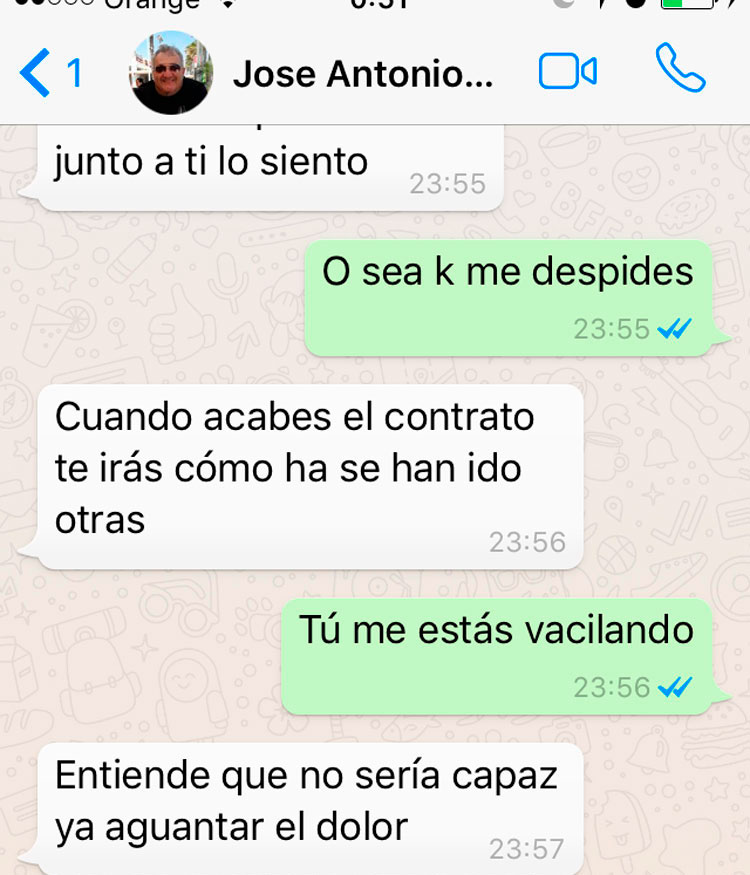 «Cuando acabes el contrato te irás como se han ido otras». Es la reacción del ya ex presidente de la asociación después de que la trabajadora, que en repetidas ocasiones a lo largo de la conversación pidió que cesara en su empeño de buscar una relación romántica, rechazase en última instancia su proposición de ser «amigo íntimo».