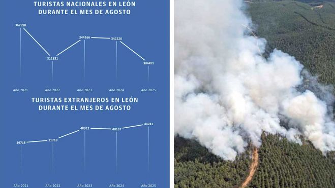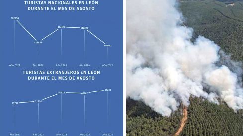 Así, con 37.729 turistas nacionales menos y con 4.074 viajeros de otros países más, la pérdida total de visitantes en León fue de 33.655 durante el agosto en el que ardieron más de 100.000 hectáreas en los montes de la provincia. Es decir, una caída global del turismo del 8,8 por ciento, bajando de la cota de las 350.000 personas que llegaron al territorio leonés en el octavo mes del año.