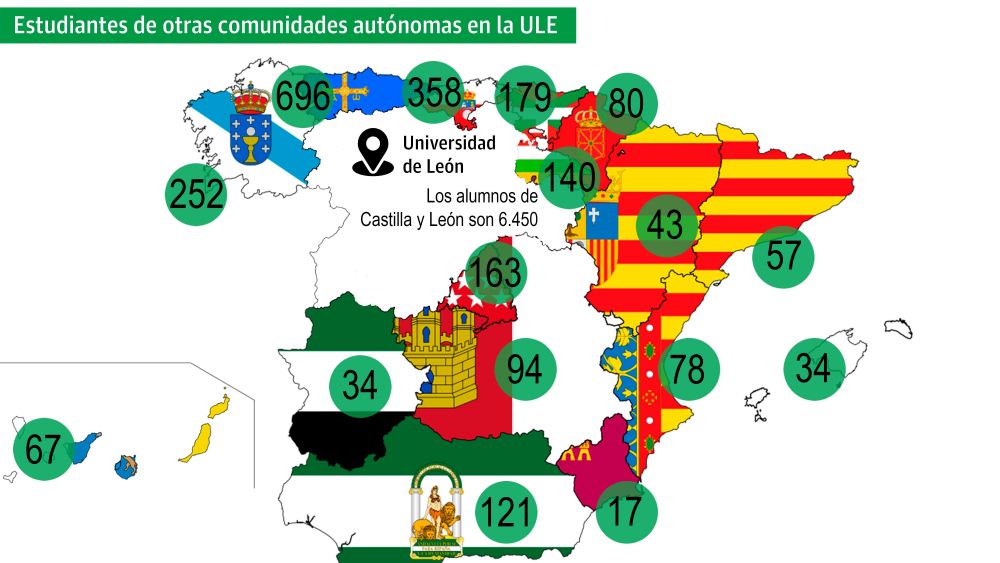 León también cuenta con una elevada presencia de universitarios procedentes de Cantabria y de Galicia. Aunque lejos de las cifras de Asturias, la ULE cuenta con más de 350 estudiantes cántabros y los gallegos, llegados de otra comunidad vecina, superan los 250 entre ambos campus.