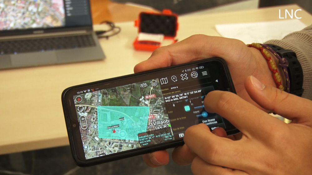 Su compañero, Gonzalo, matizaba la parte más técnica del proyecto, móvil en mano, donde se podía observar el punto rojo de un supuesto incendio. "Si abrimos este punto, a un guardabosques le permite conocer las coordenadas exactas, la altitud, al velocidad y direección del viento... Criterios bastante importantes para la extinción de los incendios", añadía.