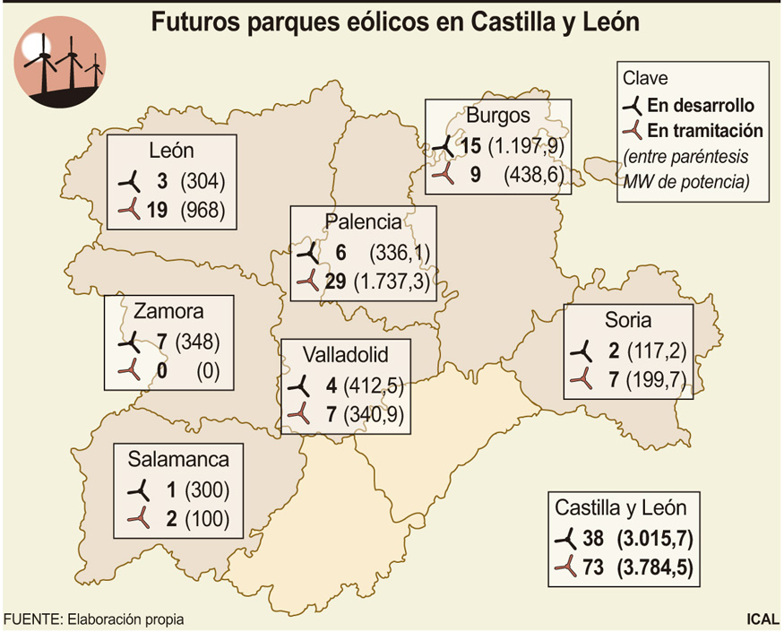 Mientras, la inmensa mayoría de los futuros parques eólicos de Castilla y León se centran en el norte de la comunidad, puesto que Burgos, León y Palencia acumulan casi dos tercios de los proyectos sometidos ya a información pública y el 78 por ciento de los parques en tramitación.