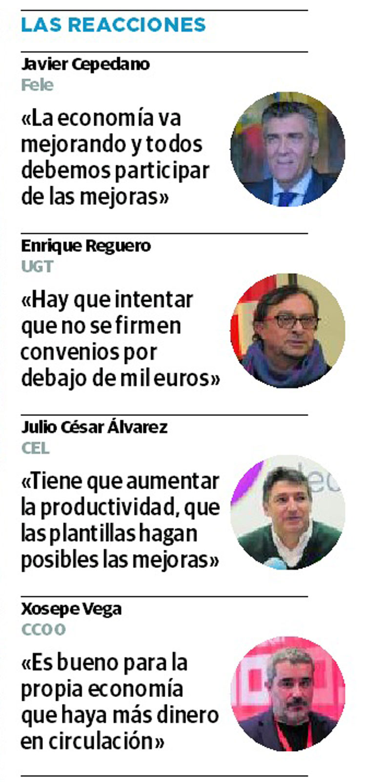 Las organizaciones empresariales y los sindicato de la provincia coinciden en señalar que el aumento del SMI es una medida positiva para la economía leonesa, aunque recuerdan que debe ir acompañada de otras medias.El presidente de la Federación Leonesa de Empresarios (Fele), Javier Cepedano, asegura que "la situación económica va mejorando y todos debemos participar de esos incrementos salariales". Cepedano matiza que "es muy importante que todo esto vaya acompañado de un incremento de la productividad" y recuerda que el único camino para lograrlo es el "compromiso" de las partes empresarial y social. En cuanto al nivel de la subida para este año con, el horizonte de los 850 euros para el 2020, el presidente de la Fele considera que es "lógico", y recuerda que en la provincia la organización que preside y los sindicatos UGT y CCOO ya trabajan para "negociar los convenios y dejarlos lo más adaptados posibles a la realidad empresarial y social" con importantes acuerdos en los últimos meses.