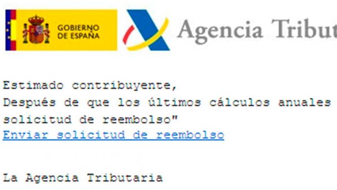 Utilizando un reclamo como el del supuesto asunto «reembolso de impuestos» o «pago de sanción», el usuario pincha en el enlace y es dirigido a un sitio web que simula ser una página de la Agencia Tributaria española. La falta de precisión del lenguaje del mensaje debería hacernos sospechar.