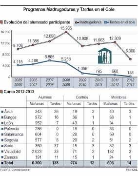 De este modo, en el curso 2012-2013 usaron el servicio de Madrugadores un total de 6.300 alumnos de 274 centros educativos de Castilla y León a los que atendieron 603 monitores. La evolución del programa fue desde los 9.706 del curso 2005-2006; a los 11.385 del siguiente; los 12.690 del 2007-2008, mientras que en el curso 2008-2009 se alcanzó una cifra récord de participantes, con 15.985, para descender en el 2009-2010 hasta los 10.908 y crecer otra vez en 2010-2011 hasta los 11.663 y 12.309 en 2011-2012.