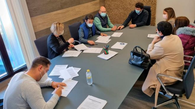 La sala de reuniones anexa a la Alcaldía del Ayuntamiento de Villaquilambre ha sido el escenario elegido para que su regidor, Manuel García, y la presidenta de la Junta Vecinal de Navatejera, Berta Llamazares y representantes de los trabajadores rubriquen el acuerdo de cesión de la gestión del polideportivo de la localidad.