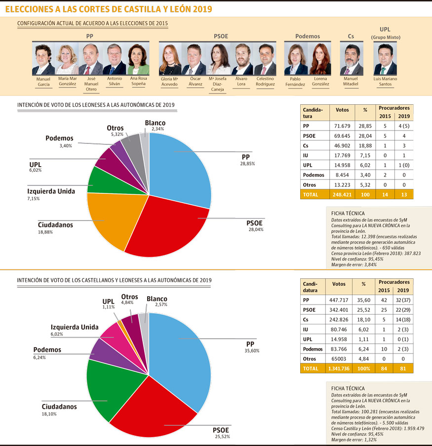 El PP se mantendría como la fuerza más votada en el conjunto de la comunidad y también en la provincia de León, según se desprende de un reciente sondeo elaborado por SyM Consulting. Concretamente, los populares obtendrían entre 32 y 37 procuradores autonómicos, lo que podría suponer la pérdida de hasta diez representantes con respecto a los 42 que tiene en la actualidad.