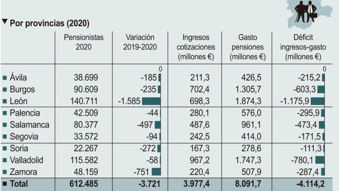 El déficit del sistema de pensiones en las provincias de la comunidad, es mayor en León, 1.175,9 millones de euros, seguida por Valladolid, 780 millones; Burgos, 603,3; Salamanca, 473,4; Palencia, 295,9; Zamora, 287,4; Ávila, 215,2; Segovia,171,4; y Soria, 111,3.