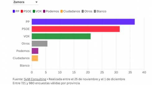 El Partido Popular repetiría como la fuerza más votada en la provincia de Zamora, con un 36,63% de estimación de voto y tres procuradores.
