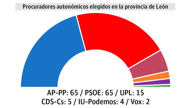 En este dominio de los populares, la más contundente de sus victorias se produjo en 2011, cuando alcanzaron una clara mayoría con ocho procuradores por León. El PP volvió en 2015 a ser el partido más votado de la provincia, pero obtuvo los mismos cinco parlamentarios que el PSOE y en 2019 fue superado por los socialistas.