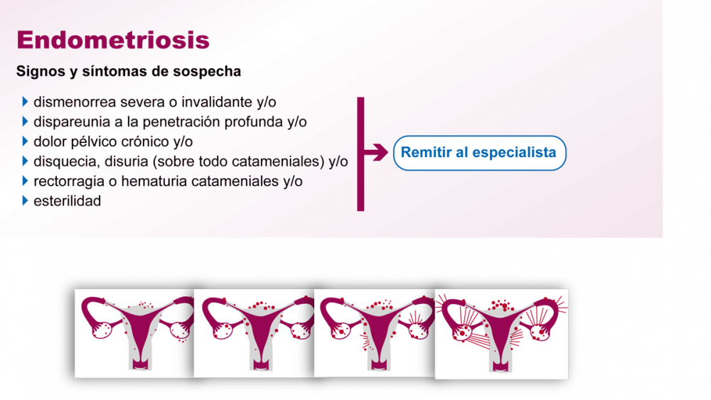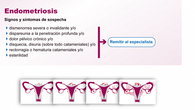 Por otro lado, las mujeres con endometriosis sintomática, el principal síntoma suele ser el dolor pélvico cíclico que adopta varios patrones: dismenorrea severa que suele ser progresiva, dispareunia intensa, dolor pélvico crónico, dolor limitado a la ovulación. Estos síntomas relacionados con la menstruación se asocian al sangrado anormal o síntomas intestinales. A pesar de que son síntomas poco específicos, si se da alguno de estos síntomas combinado con dismenorrea severa o bien la presencia de síntomas no ginecológicos, se debería sospechar de que se padezca endometriosis.