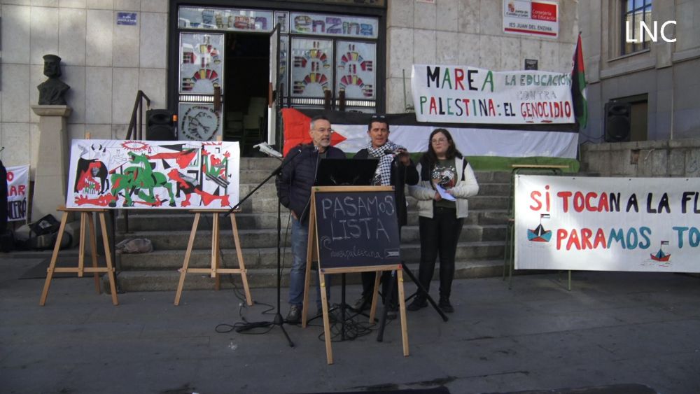 "Nos hemos concentrado aquí justo cuando Israel ha asaltado la flotilla de la libertad en un acto más de los que estamos haciendo desde septiembre, con varias concentraciones y una lectura como esta en el Legio VII la semana pasada", ha explicado Enrique Javier, catedrático de la Universidad de León y miembro de Marea Palestina, educación contra el genocidio. "En memoria de los niños y niñas que no han podido empezar este curso porque han sido asesinados por una limpieza étnica que se está produciendo, merece la pena este esfuerzo que etsamos haciendo", añadía.