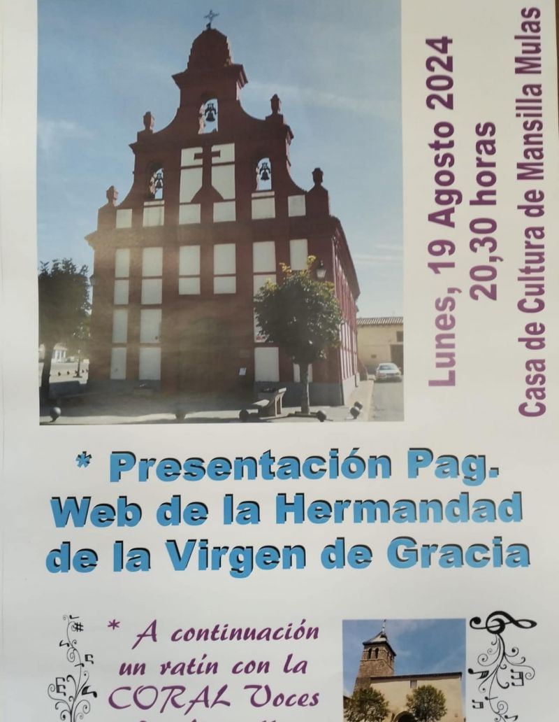La Casa de Cultura de Mansilla de las Mulas acogerá este lunes, 19 de agosto, la presentación de la nueva página web de la Hermandad de la Virgen de Gracia. El acto tendrá lugar a las 20:30 horas, en el marco de la programación de la XVIII edición de la Semana Cultural 'Pícara Justina'.