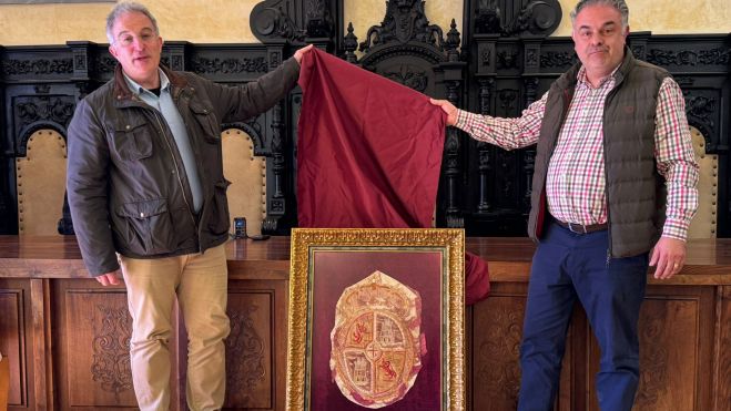 El alcalde de Astorga, José Luis Nieto, y el exregidor y presidente de dicho centro de estudios, Arsenio García, presentaron dieron este miércoles a conocer esta recuperación del patrimonio histórico de la ciudad. En concreto, se trata del Escudo Real de la Corona de León y Castilla «de la antigua Bandera Municipal de la Bimilenaria, Augusta, Magnífica, Muy Noble, Leal y Benemérita de la Patria Ciudad de Astorga (1871–1873)».