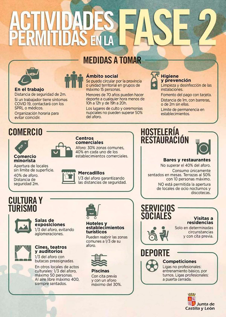 De esta forma, los leoneses podrán volver a acudir desde este lunes a centros comerciales, al interior de los bares o a celebrar reuniones con un máximo de 15 personas. Del mismo modo, se suprimen las franjas horarias para dar paseos y las personas menores de 70 años pueden realizar actividad física no profesional en cualquier franja horaria excepto entre las 10:00 y las 12:00 y de 19:00 a 20:00.