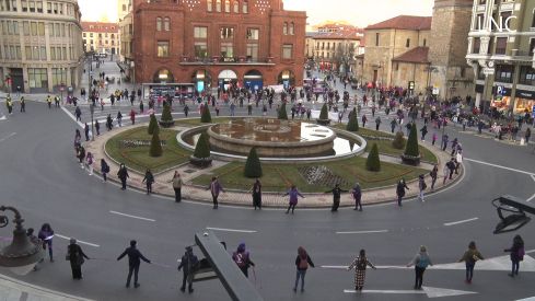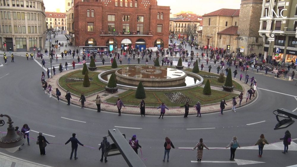 En la ciudad de León, la concentración del 8M se ha desarrollado en la tarde de este lunes en torno a la plaza de Santo Domingo con tres anillos concéntricos formados por 225 mujeres unidas por cintas moradas, el color de las reivindicaciones por la igualdad. En las calles aledañas, un buen número de mujeres fueron repartidas por la organización para velar por el cumplimiento de los protocolos sanitarios.