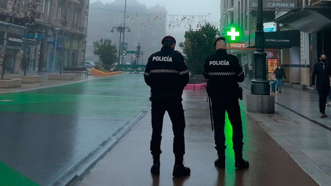 Además, tiran una de las vallas contra las dependencias de la Policía que se ubican en el Ayuntamiento de León de la plaza de San Marcelo. Los efectivos municipales dan el alto a uno de los jóvenes en la calle la confluencia de la calle la Rúa con la calle Teatro y al otro en la calle Ancha.Se tramitan las diligencias correspondientes.