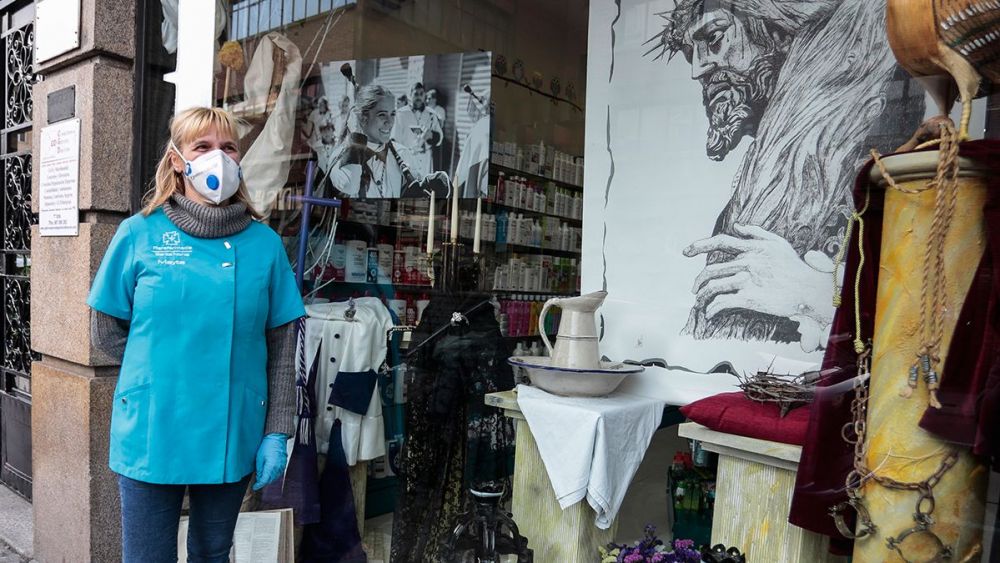 En medio de ese panorama, no falta quien se resiste a que la Semana Santa 2020 se diluya entre cuarentenas, confinamientos e incertidumbres y pone todo su empeño y dedicación en ello. La Parafarmacia Santa Nonia, en la calle del mismo nombre, da ejemplo y ofrece un complejo montaje en el que no faltan una mantilla de ‘manola’, un traje de papón, la escalera de la cruz, la esponja, la lanza, el látigo… “todo hecho a mano” recalca Mayte Frayle, miembro de la Real Hermandad de Jesús Divino Obrero, donde toca la gaita), responsable del establecimiento.