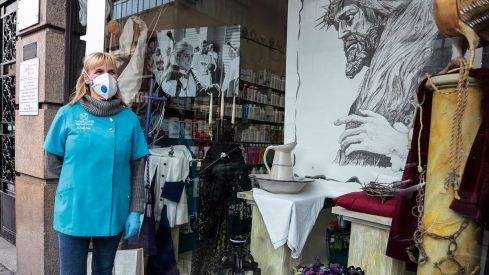Adelina López atiende el estanco situado junto a la plaza de Santa Ana, que cada Semana Santa luce un decorado diferente -como lo hace en otras épocas del año-. De él se suele encargar su hijo David, papón sumido, al igual que el resto, en la pena de la suspensión de la Semana Santa. Él colocó la instalación que representa un paso con una Virgen con manto, una cruz y el sudario a finales de febrero, antes de iniciarse la crisis del Covid-19, “porque no esperábamos esto” y ahora duda si mantenerla “porque casi no hay gente que la vea” o desmontarla y guardarla para el próximo año.