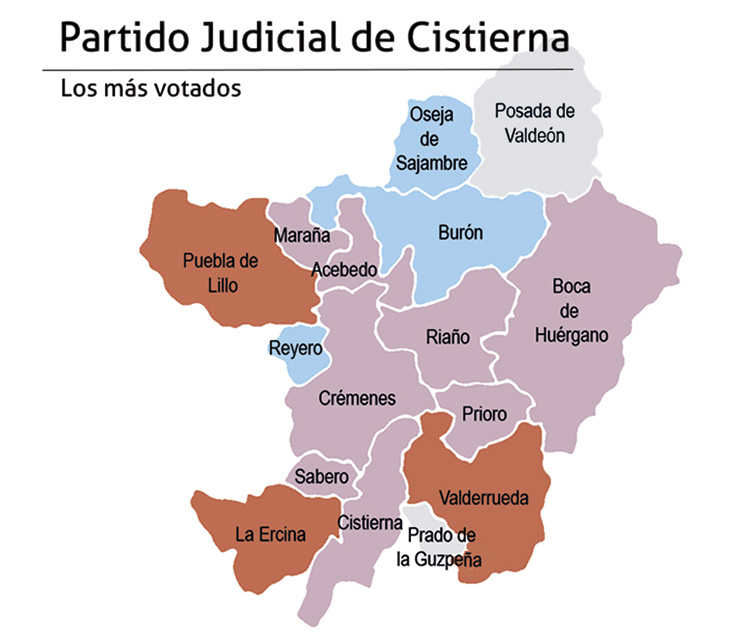 Partido Judicial de Cistierna se tiñó de púrpura este 13-F. UPL fue la fuerza más votada en nueve de los 16 ayuntamientos de la demarcación: Cistierna, Sabero, Crémenes, Riaño, Prioro, Boca de Huérgano, Acebedo, Maraña y Prado de la Guzpeña (donde empató con el PSOE). En la cabecera de la comarca, los leonesistas se anotaron una contundente victoria con el 43,3 por ciento de los votos y sumando más apoyos que entre socialistas y populares juntos. El PP se llevó una mayoría absoluta en Oseja de Sajambre y también fue la fuerza más votada en Burón y Reyero. Valderrueda, La Ercina y Puebla de Lillo fueron los municipios en los que ganó el PSOE. En Posada de Valdeón se registró un empate entre PP y PSOE.