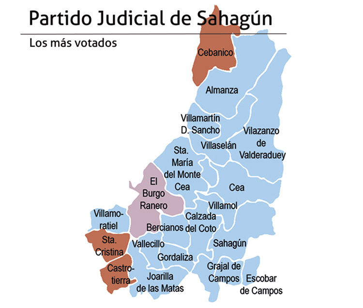 Partido Judicial de Sahagún. Los populares ganaron con solvencia en la cabecera de comarca y fueron los más votados hasta en 16 de los 20 ayuntamientos de la demarcación. En Almanza y en Escobar de Campos la victoria del PP se produjo por mayoría absoluta. El PSOE fue la fuerza más votada en estas autonómicas en Cebanico, Santa Cristina de Valmadrigal y Castrotierra de Valmadrigal. Por su parte, la única victoria leonesista en esta zona de la provincia llegó en El Burgo Ranero, donde UPL superó por un voto al PP.