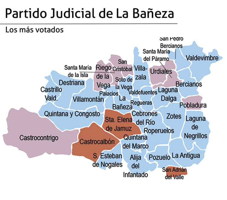 Dominio popular en La BañezaEl Partido Popular fue el vencedor de las elecciones autonómicas en el Partido Judicial de La Bañeza. Además del triunfo en la cabecera de la comarca, los populares tiñeron de azul la mayor parte de la zona y se anotaron victorias en municipios como Alija del Infantado, Laguna de Negrillos o Valdevimbre. UPL fue el segundo partido que más ayuntamientos se llevó en esta demarcación, destacando su triunfo por mayoría absoluta en Santa María del Páramo, el único de tal contundencia de los leonesistas en toda la provincia de León. Por su parte, el PSOE se hizo fuerte en Castrocalbón, en Santa Elena de Jamuz y en San Adrián del Valle.