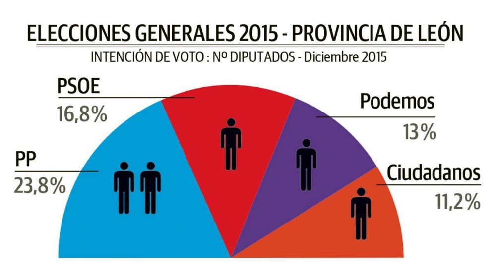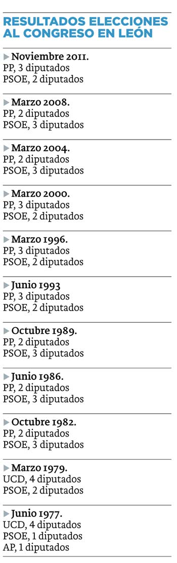Se avecinan cambios. Como ya pasó en mayo en las elecciones municipales, los comicios del próximo 20 de diciembre se presentan muy disputados, tanto que parece que, por primera vez en la historia de la democracia, León podría tener en el Congreso de los Diputados representantes de otros partidos que no sean PP y PSOE, los que tradicionalmente se han ido repartiendo los cinco escaños, dos a dos y uno ‘bailando’ a un lado o a otro, según las circunstancias. Los más escépticos, los que votaron a unas siglas en 2011 y no contemplan ejercer su derecho a voto estas elecciones, son los populares Según la encuesta realizada por SyM Consulting para La Nueva Crónica, la intención de voto se encuentra bastante dividida, como divididos quedarían los representantes leoneses en la Cámara Baja: dos para el Partido Popular (que seguiría a la cabeza en número de votos a pesar de perder un diputado); uno para el PSOE, que también cedería uno de los suyos, y uno y uno para los dos grandes partidos emergentes: Podemos y Ciudadanos.