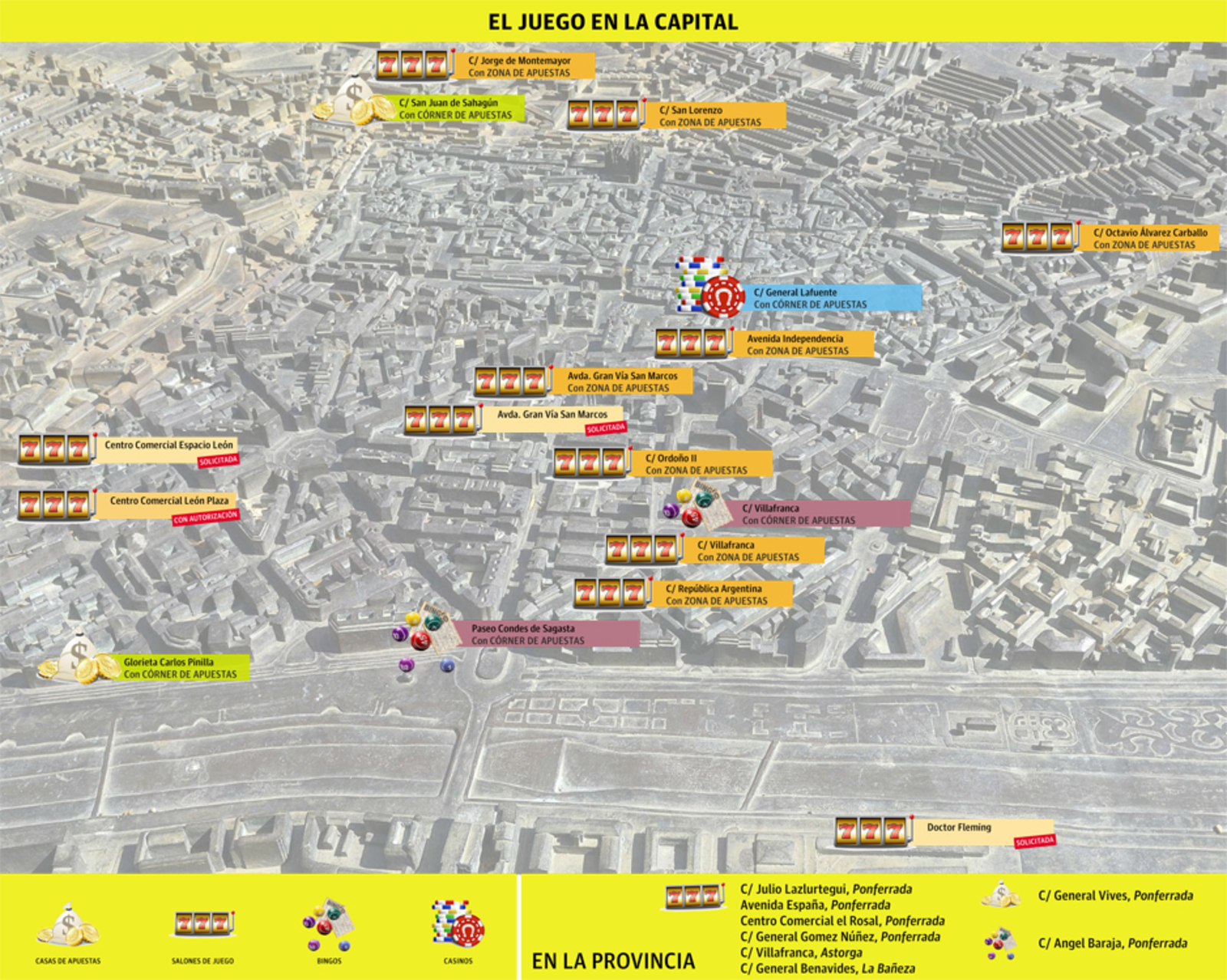 La mayor concentración está en la capital leonesa, donde a su vez, como se puede ver en el gráfico que acompaña esta información, también están bastante agrupados en determinadas zonas. Tal y como se recoge en la información facilitada desde la Junta, en León ciudad hay abiertos actualmente ocho salones de juego, todos con zonas o córners de apuestas; tres casas de apuestas, y dos bingos y un casino también con córners de apuestas. Además, está aprobada la instalación de un nuevo salón de juego en el Centro Comercial León Plaza y hay otras tres solicitudes en trámite para la capital.