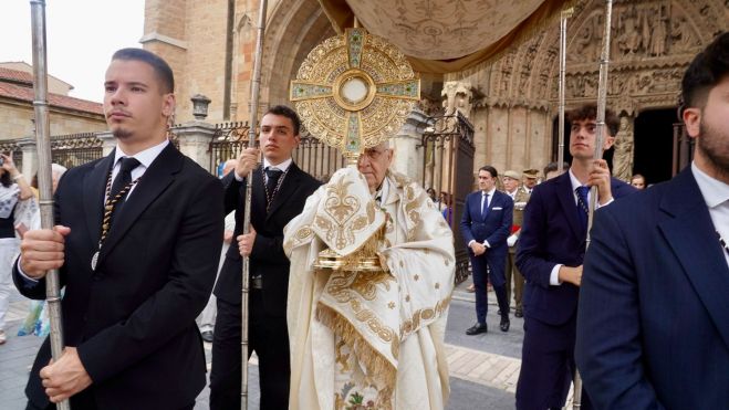 Una solemne eucaristía presidida por el obispo emérito de León, Julián López, en la catedral precedió este domingo a la tradicional procesión del Corpus Christi, que siguió el recorrido marcado para los años impares por el centro de la capital.