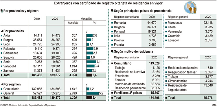 Por último, un estudio de las principales nacionalidades que acoge el territorio castellano y leoneses, pone de relieve que en el caso de las personas con libre circulación, eran mayoritariamente rumanos y búlgaros, con 44.670 y 34.171 individuos, seguidos por portugueses, 19.321, italianos, 4.736, polacos, 3.793 y franceses, 3.669.En cuanto a los extranjeros del Régimen General, el origen del colectivo más numeroso era África y en concreto, Marruecos, con 22.418 personas, seguida esta nacionalidad por la China, con 3.935. Asimismo, Castilla y León acoge amplios colectivos de América del Sur, sobre todo de Venezuela, 3.573; Colombia, 3.429; y Ecuador, 2.657.
