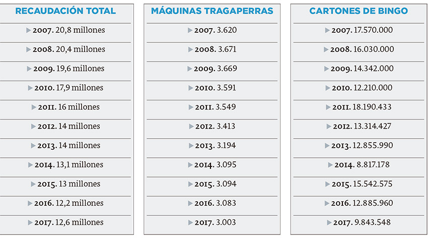 En cuanto a los bingos (hay tres en la provincia), la recaudación por tasas e impuestos fue en 2017 de casi 1,2 millones de euros, mientras que en 2016 se había situado en casi 1,4 millones. Los bingos adquirieron para su distribución más de 9,8 millones de cartones frente a los casi 12,9 de 2016.
