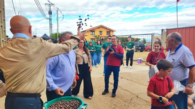 El pueblo se reunió a las cinco de la tarde a las puertas de casa del mayordomo de la Cofradía de Nuestra Señora del Rosario –el señor Rodríguez Martínez (Jandrín) este año–, para recoger la colación de avellanas, que es de una ‘mortera’ por cabeza, y un vaso de vino o licor. Pero también es una fiesta en la mirada fijada para todos lados, que además de los puñados que cada uno se lleva de casa del mayordomo, las avellanas empiezan a ‘llover’ por encima de todos los presentes.