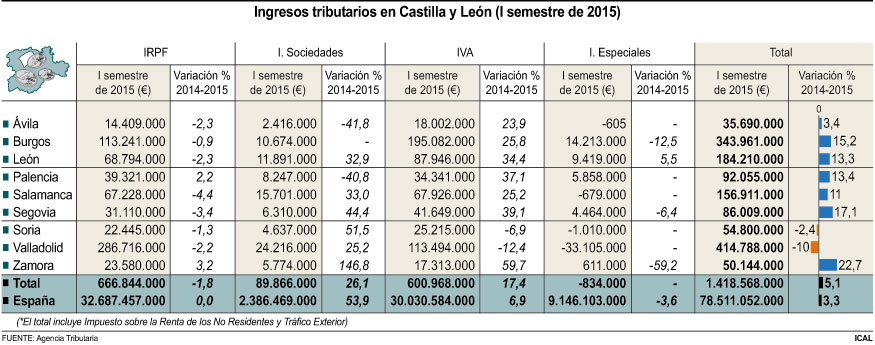 Los datos de la Agencia Tributaria consultados por Ical reflejan que la recaudación por IRPF se situó en Castilla y León en los primeros seis meses del año en los en los 666,8 millones de euros, con un descenso del 1,8 por ciento respecto a 2014, cuando en España se mantuvo estable, con 32.687 millones. Los Impuestos Especiales arrojaron un saldo negativo de 834.000 euros, mientras que a nivel nacional superaron los 9.146 millones (-3,6 por ciento).