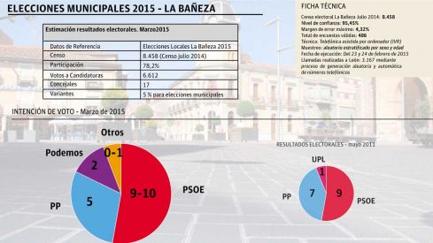 Si los comicios se celebrasen hoy y según los datos de estimación de voto de la encuesta realizada entre la población bañezana mediante cuestionario de llamadas telefónicas y un nivel de confianza superior al 95%, la Corporación Municipal de La Bañeza quedaría compuesta por 9 concejales del PSOE, cantidad suficiente para respaldar la mayoría simple que el partido tuvo en el año 2003 y las dos mayorías absolutas consecutivas obtenidas en las elecciones del 2007 y del 2011, gracias al 42,1% de los sufragios obtenidos con un censo de 8.458 electores y una participación con voto a candidaturas de 6.612 (cifra en línea con los resultados de los últimos comicios).